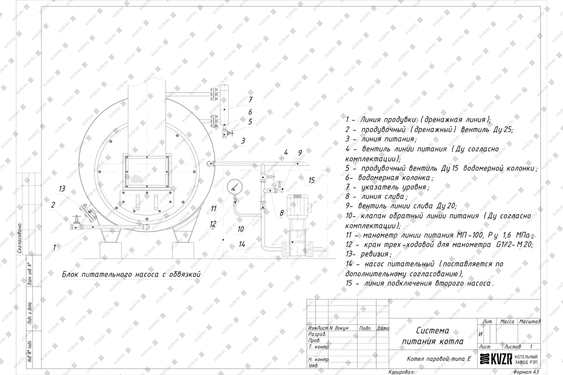 При работе котла питание водой парового котла Е-1,0-0,9 ЛЖ дизельного производится через штуцер.