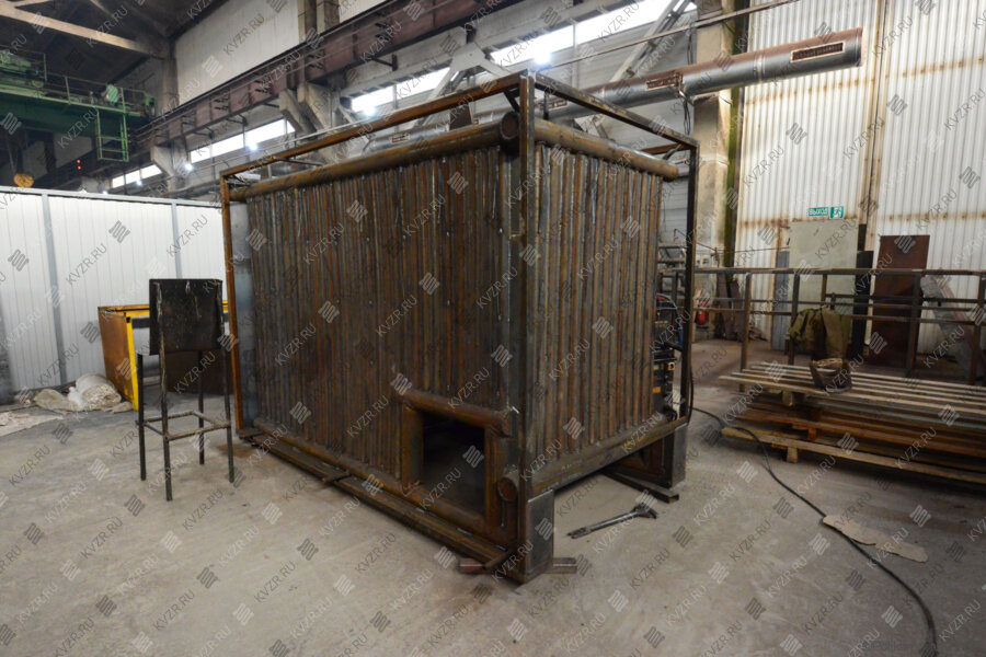 Блок водонагревательного котла КВм 2,5 МВт представляет собой горизонтальную стальную сварную конструкцию, состоящую из трубной системы (радиационной и конвективной поверхности нагрева), опорной рамы и каркаса с теплоизоляционными материалами, обшитого листовой сталью. Топочная камера состоит из труб Ø 57x3,5 мм. Конвективная поверхность нагрева состоит из пакетов выполненных из труб Ø 32x3 мм, для интенсификации теплообмена трубы пакетов расположены в шахматном порядке.