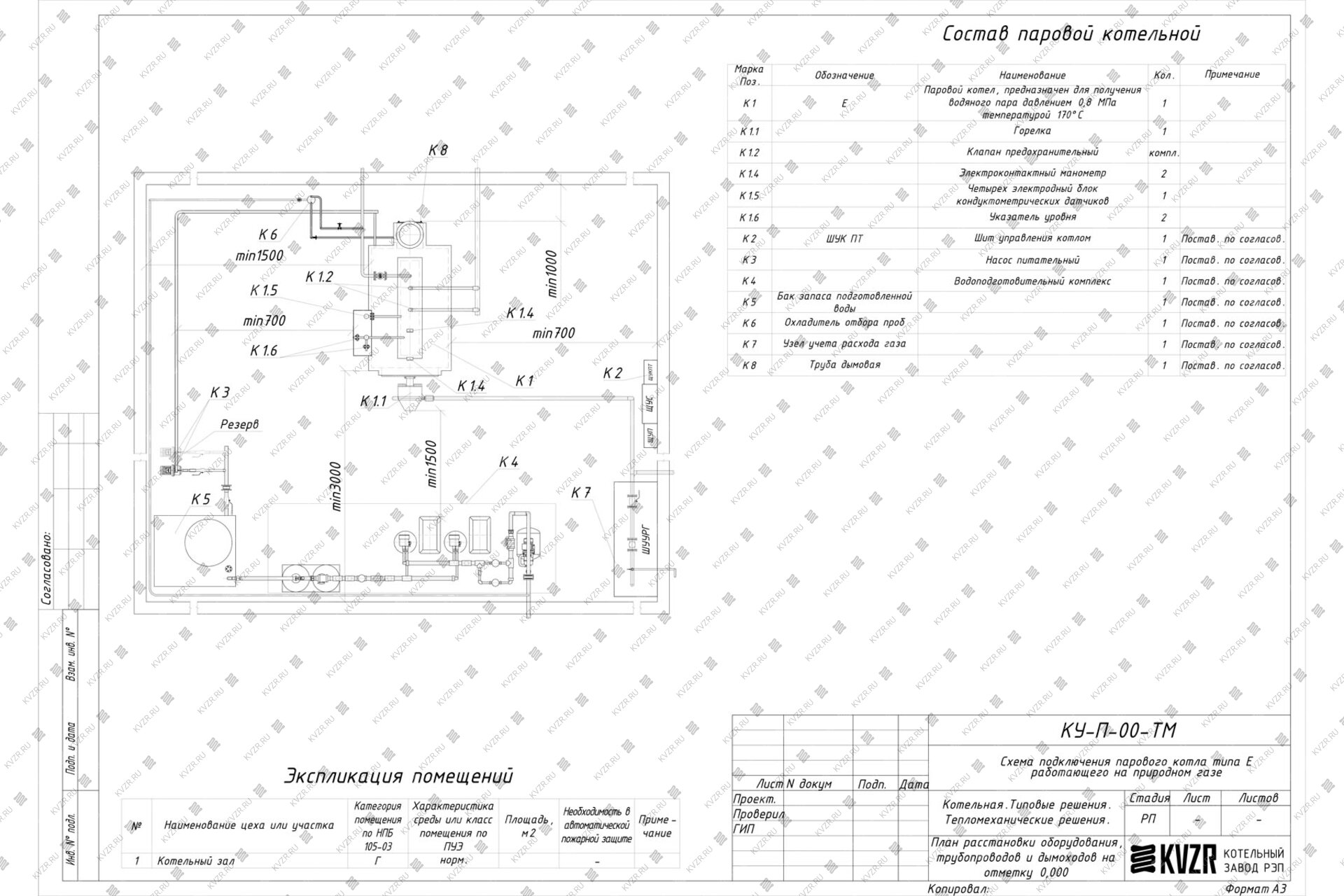 Чтобы правильно подключить газовый паровой котел 700 кг / 0.7 т пара -170°С -0,9 МПа / 9 кгс/cм² в котельной необходимо оставить проемы для обслуживания оборудования во время эксплуатации. На представленной здесь схеме обозначены их размеры. Кроме того, в данной примерной схеме монтажа паровых котлов и оборудования указан перечень минимально необходимого вспомогательного оборудования.