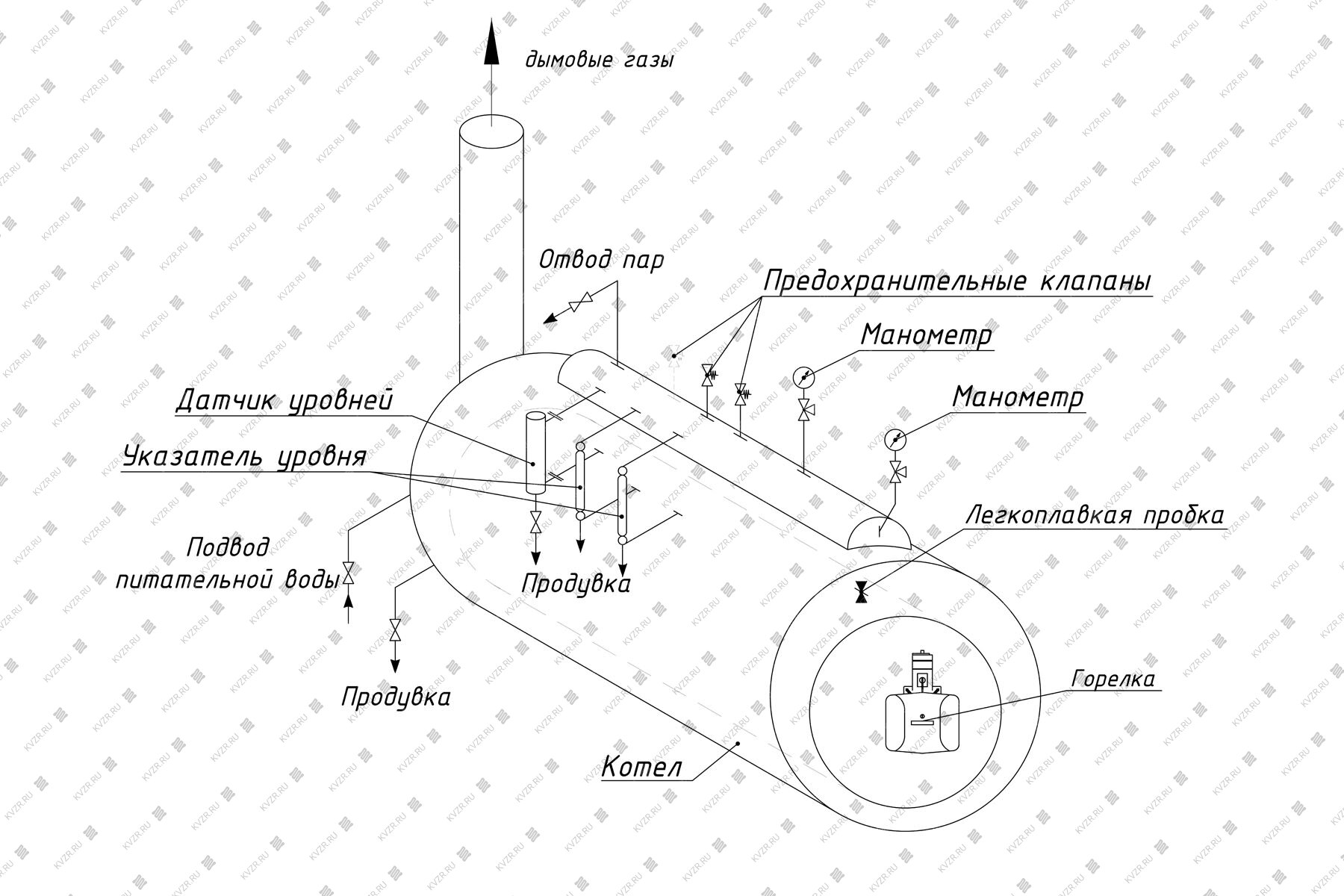 В верхней части обечайки верхнего барабана установлены штуцера для крепления пружинных предохранительных клапанов, главный пароотводящий штуцер, трубка крепления манометра, труба подвода питательной воды, внутри верхнего барабана смонтированы сепарационное устройство и труба ввода питательной воды.